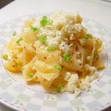 4.将百叶倒入拌盆,加盐、熟油辣椒和蒜泥拌匀,入盘时撒上葱花,浇上香油即成。