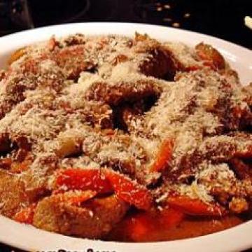 3.快火下油起锅,用少许盐爆香洋葱和萝卜软,加入磨菇略炒一下,再加汁料调味,洒上面包糠即成。