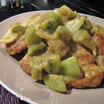 3.快火下油约1汤匙起锅,洋葱和1/2茶匙盐炒匀至软,加入汁料煮开,加入奇异果再炒匀,最后淋到猪排上即成。