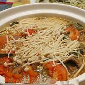 2.快火下油(约1汤匙)起锅,先加入雪菜和1/2茶匙糖炒香,再加入蕃茄和1/2茶匙糖和盐炒软,加入猪肉和水至刚盖过材料,盖盖煮10分钟,熄火,混入金针菇和粉丝及汁料调味,盖盖煮3分钟即成。