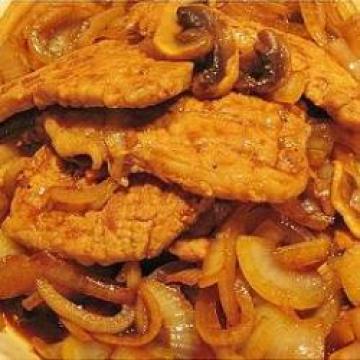 猪里肌2块,洋葱1个,沙拉油45㏄,梅林辣酱油15㏄,酱油15㏄,糖5g,蕃茄酱15g,水150㏄,酱油45㏄,米酒30㏄,糖5g,盐3g,黑胡椒10g,姜末15g,太白粉水15㏄,蒜末10g
