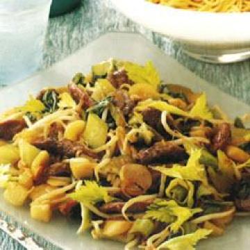 无骨鸭胸肉680克,五香粉2茶匙,西洋芹4根,留少量叶子作为装饰,小白洋葱225克,大梨2个,罐装荸荠(马蹄)1杯,沥干,切片,白菜225克,豆芽11/2杯,芥花油2汤匙,米醋或雪利酒醋3汤匙,淡酱油3汤匙,蜂蜜2汤匙,面条350克,煮熟