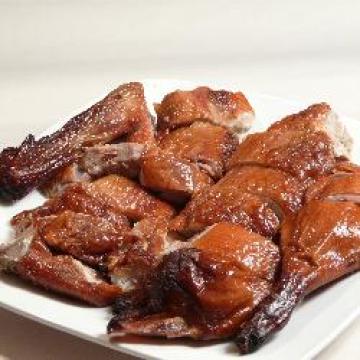 4.取另一个炒锅在中火上预热,倒入500毫升菜油,加热至八成,将火调小。把装鹅的锅移至油锅旁,小心用大铁勺舀出热油淋在仔鹅上,翻转鹅体,使均匀淋上油,可重复用沥下在锅里的油继续淋,直到鹅皮变脆,呈金黄色即可。待凉冷后,宰成小块,装盘。