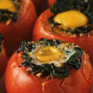 3.用纸巾把西红柿内抹干,酿入炒好的蔬菜,放入烤盘。每个西红柿顶上打一个蛋,上面罩铝箔纸,但不要封合。烤20至25分钟,至鸡蛋凝固即可。