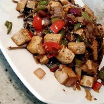 花生油45毫升,老豆腐900克,切方块,红洋葱1个,切成碎块,红辣椒1个,切成碎块,青辣椒1根,切成碎块,大蒜3瓣,压碎,热水75毫升,白葡萄酒醋45毫升,酱油45毫升,黄砂糖15克,玉米淀粉5克,干辣椒粉5克,(选择性)