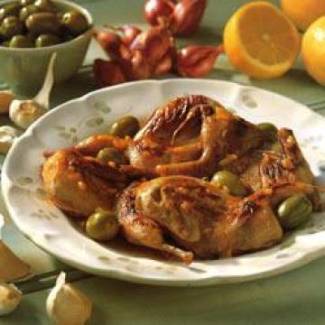 大蒜2瓣,冬葱4个,柠檬1个,青橄榄120毫升,新鲜鹌鹑8只,对切,橄榄油3汤匙,黑胡椒适量,藏红花丝1茶匙,清鸡汤120毫升