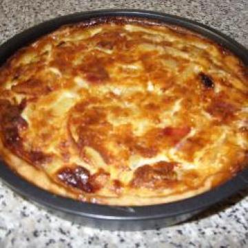 可做直径23厘米馅饼的成品油酥松饼1张,培根6片,洋葱1个,切片,鸡蛋3个,打散,牛奶350毫升,盐1/4茶匙,切达奶酪丝150克,面粉1汤匙