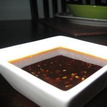 蒸馏苹果醋250毫升,酱油250毫升,蔬菜油125毫升,芝麻油1汤匙,烤芝麻1汤匙,碎辣椒干半茶匙,辣椒粉1小搓