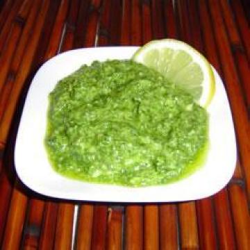 新鲜罗勒叶125克,切好的胡桃肉175克,蒜头4个(去皮),现搓的意大利干酪2汤匙,橄榄油250毫升,盐、胡椒适量