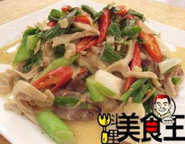 1.熟猪肚切小条,蒜头切片,姜切丝,辣椒切斜片,蒜苗切斜段备用