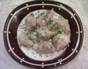 3.取一个大碗,放入取出的芋艿、盐、椰浆、胡椒粉、芹菜末和青蒜末即可完成椰浆芋艿
