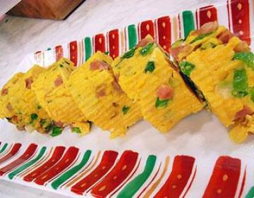 2.锅中烧热2大匙油,倒入香肠蛋汁,以筷子划圈炒到快凝结时,起锅盛在竹帘上,再卷成圆柱状,挤出多余的汤汁,利用余热等到蛋汁完全凝固定型并放凉后,再拿掉竹帘,切成厚片排入盘中即可完成