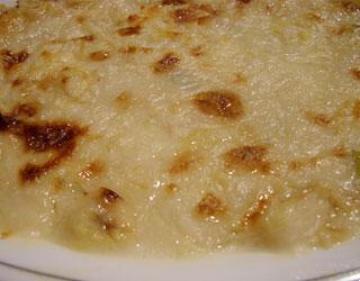 4.锅中烧热2大匙油,将面粉炒成煳状,再倒入炒蔬菜料的汤汁搅拌均匀后,加入鲜奶搅匀煮滚,先盛出一部分备用,并在剩余的奶煳中,放入拆散的干贝丝,再放入先盛出的蔬菜料拌匀后盛入容器中,撒上起司粉,放入烤箱以220-240的温度烤约10分钟,等到烤至表面焦黄即完成西式的焗烤瑶柱四蔬了