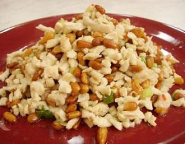 材料:,鸡胸肉1付,松子半杯,葱1根,红辣椒1支,蛋白1个,太白粉1小匙