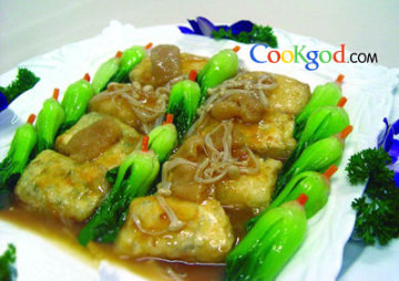 3、锅内放底油,烧至六成热后放葱姜爆香,放上汤、鸡粉、美极上汤、蚝油、盐调味,放入飞过水的金针菇、竹笙、炸好的豆腐一起小火煨3分钟装盘。将炒好的菜心围边即可。