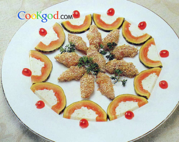 3、另一个木瓜削去外皮,切成块,修成橄榄形,裹上沙拉酱,滚匀麦片,放在盘中央即成。