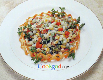 3、将黄瓜丁、胡萝卜丁、玉米粒外面包上制好的鱼料子,下油锅炸熟后捞出,炒制好,盛在铺好油菜的盘内即成。