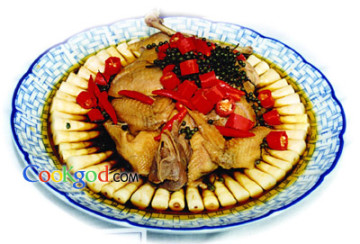 4、鸡捞出放凉,斩重约30克的块,按照鸡的圆形摆放在盘内的笋上;锅内放入色拉油,烧至六成热时放入小尖椒段、青花椒小火翻炒1分钟,入鸡汤、蒸鱼豉油小火烧开,用盐、味精、鸡精调味后淋于鸡上即成。