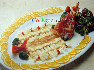 此菜运用中式烹饪方法,配以西餐调味料,更好地突出了海鲜的鲜甜味及营养价值。