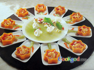 2、南瓜刻成玫瑰花形盛器,放入蒸好的红花、鹅掌,制熟即成。