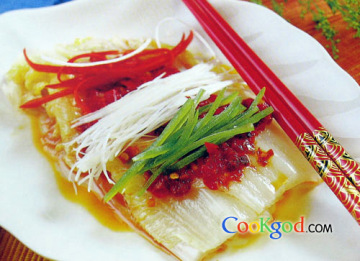 3、锅内留油少许,用葱、姜、八角、泡椒丁炝锅,烹入鲜汤,放入白糖、料酒、白菜,用小火烧至白菜软烂入味时,放入味精和盐调味盛出。上桌前淋上花椒油、泡椒丁和青红椒丝及葱丝即成。