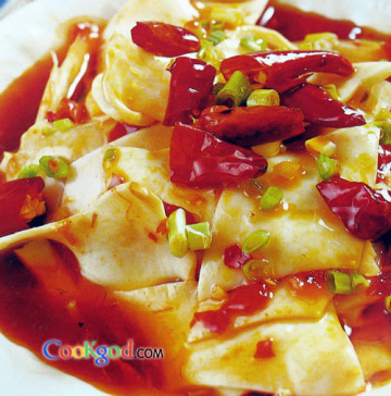 4、最后,也就是最重要的一道工序:花椒面、辣椒面,大把大把地撒下去,再淋上一层滚油。一盆还在吱吱叫的“水煮肉片”就上桌了。