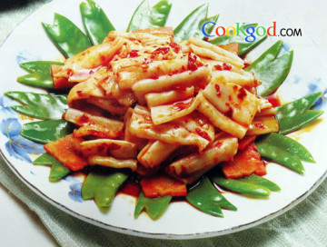 3、将荷兰豆、萝卜花焯水过凉,放在盘底;锅烧热油,爆香辣椒酱,烹入料酒,加味精、盐,倒入墨鱼片炒匀,勾芡,淋香油,倒在荷兰豆、胡萝卜上即可。