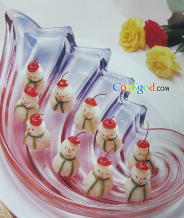 3、糯米洗净,放盒内加入沸水淹没,放沸水笼内旺火蒸熟,取出,放盆内,加入精盐、鸡精、熟化鸡油捣细蓉,先取三分之二的熟糯米包上大馅心,捏成10个大圆球,再将余下的糯米包上小馅心,捏成10个小圆球,大球放下,小球放上,粘稳,成孩童雏形,再将黑芝麻作眼,木瓜作鼻,西红柿作嘴,韭菜叶作领带,带把的西红柿作帽子,分别点缀于孩童头部的适当位置,摆放盘内即成。