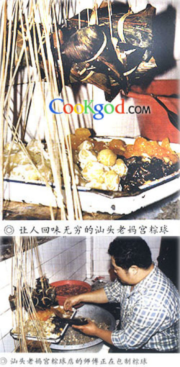 菜 名:汕头老妈宫粽球主 料:糯米。馅料分咸甜两种。咸馅材料是虾米、香菇、腊肠、铁脯、莲子、栗子和南乳猪鬃头肉;甜馅材料是水晶馅、乌豆沙馅和绿豆沙馅。做 法:老妈宫粽球的