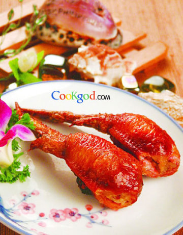 5、将处理好的鸡翼挂上上皮水后吹干水分,放入烧至五成热的色拉油中小火浸炸4分钟,捞出控油,装入盘中即可。