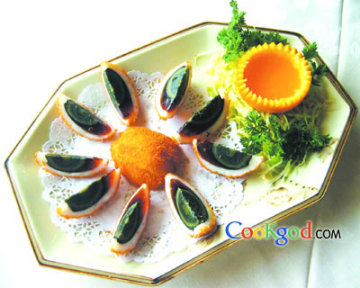 墨鱼胶100克,皮蛋2只,鲜橙1个,蛋黄液1个,面包糠100克。调料色拉油1000克,盐2克,糖5克,湿生粉5克。