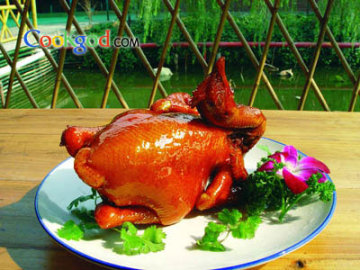 6、食前由服务员将鸡斩成30克一块的块,放入盘子内,浇上烧热的卤水即可食用。一般而言,卤制1只净重800克的鸡,需要卤水1000克。