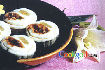 3、将发面皮压成长条形,宽约25厘米,在一边铺上豆沙、咸蛋黄,一边铺上叉烧肉,两边朝中间卷成一条,切件放入铁盏内,上蒸笼蒸10分钟即成。