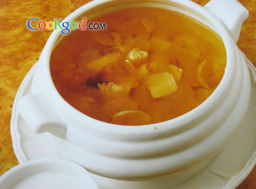 1、雪蛤膏用清水浸2小时,拣去杂质,放入雪蛤膏汆水料汆水,沥干水分。