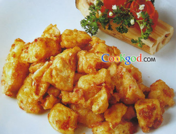 4、把冷却的老豆腐小丁回热锅油里高温炸,并倒入蛋浆,让高温油炸出蓬松蛋花,捞起滤油后上盘。
