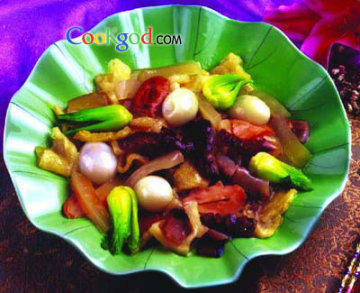 此菜集高档原料于一盘,可谓高朋满座,欢庆一堂。