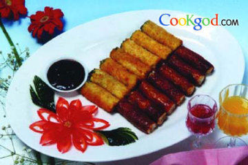 3、将两种卷下入五成热油中用中火炸8-10分钟至熟装盘,与甜面酱一起上桌即成。