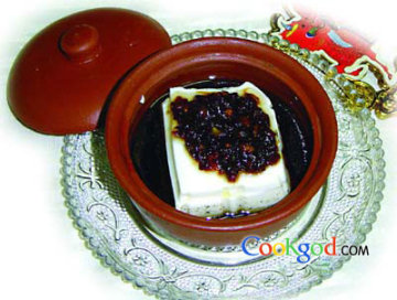 2、葱末、蒜泥、冬菜、黑胡椒粉拌匀后放在豆腐上,浇上豉油皇,入温度180℃的烤箱中烤5分钟至汤汁沸腾即可。