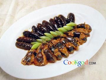 4、将莴笋改刀成橄榄形,焐油至熟,与巴鱼、辽参同摆盘中,勾鲍汁芡即成。