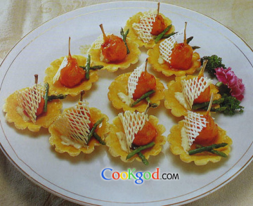 鸡翅10只,红酒、芦笋各150克,泰国鸡酱、奇妙酱各50克,白巧克力架100克,酥盒10个,脆皮酱、水果汁各适量