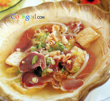鸭血200克,鸭胗、鸭肠各100克,豆芽50克,豆腐果100克,葱花少许调味料精盐、味精各少许,高汤适量