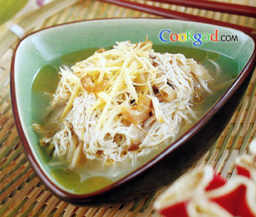 3、出锅前再用旺火烧开,放味精,将干丝连汤倒在汤盆里,撒上鸡丝、姜丝即成。