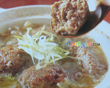 1.肥肉细切成丁,瘦肉细切粗斩成肉泥,再把两种肉合起来粗斩几下,使肥瘦肉拌匀,放入钵内,加入葱姜水汁,黄酒,盐,味精和适量的水,一起拌匀搅上劲,成肉泥,菱粉用水调匀,在手上沾一点菱粉水,把肉泥捏成四个球待用;