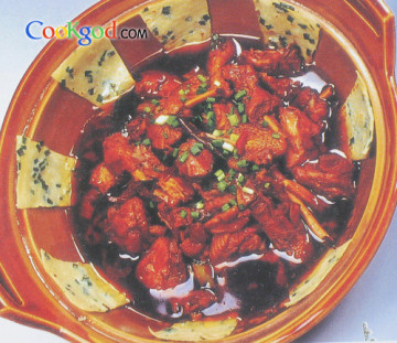 4、沙锅上火,放入草鸡块、高汤、姜、酱油、白糖、绍酒,小火慢煲1小时,待鸡煲烂时用味精调味,薄饼切成块,围贴再煲的四周即可上桌。