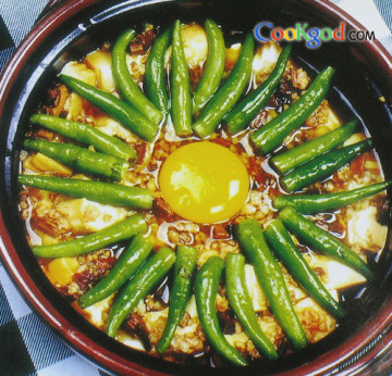 2、尖椒过油,肉末略煸,茶树菇焯水,与酱油、鸡汤、绍酒一同放入沙锅,上火煨制,再放精盐、味精调味,上桌前豆腐中间磕鲜鸡蛋1只。