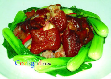 6、将扣碗中汤汁滗出,猪蹄翻扣盘中,汤汁在锅中勾芡淋明油浇在猪蹄上,洒上葱花,盘四周用菜芯围边即成。