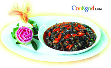3、炒锅下入色拉油大火烧到六成热,将鹅肉下锅中火煸炒30秒,烹料酒,放盐、高汤小火焖5分钟,然后揭开锅盖,蒸发水分,再将鹅肉煸出香味后,下入辣椒、仔姜大火煸6分钟,放入甜酱炒匀,再把血酱倒入其中,边倒边翻炒,拌匀后放入味精、葱段略翻炒,用水淀粉勾薄芡即可即成。