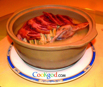 2、把老鸭和火腿一起放入沙锅中,加盐、猪油、黄酒大火烧开后,小火煨两个半小时放入笋干,再煨2个半小时,加入味精、鸡精上桌即可。