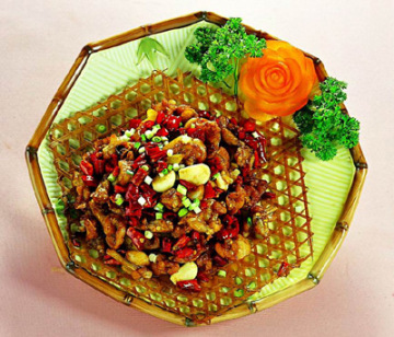 1、牛蛙宰杀去皮斩2厘米见方的块,以盐、味精、蛋清腌渍10分钟。