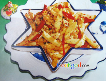 3、下入板筋条及余下调料炒匀,装盘即成。